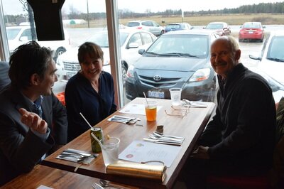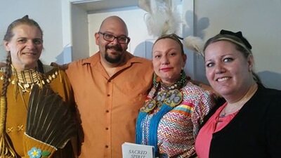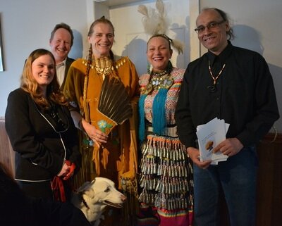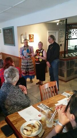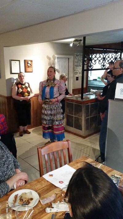 Miigwetch to Kim Newby for her cultural teachings and beautiful singing at our Orangeville Dinner Series Pow Wow Fundraiser Monday Night at Barb's Country Kitchen. Here are some of the lovely people at the dinner from left to right, Reanna Wareing, Brian Jay, Edith Roussel, Kim Newby, Gil Sipkema and Sky.
